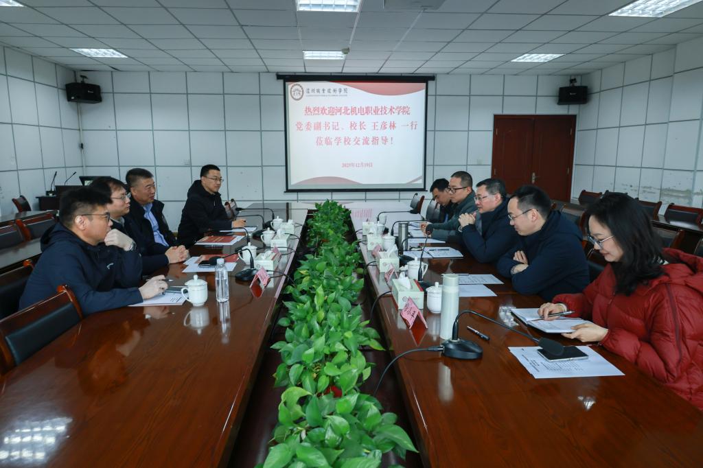12月19日,河北机电职业技术学院党委副书记、校长王彦林一行来我校调研交流。学校党委书记何杰出席座谈会,发展规划处、招生就业处(校企合作处)、泸州商学院等部门负责人参加会议,座谈会由党委常委、副院长鲍学东主持。