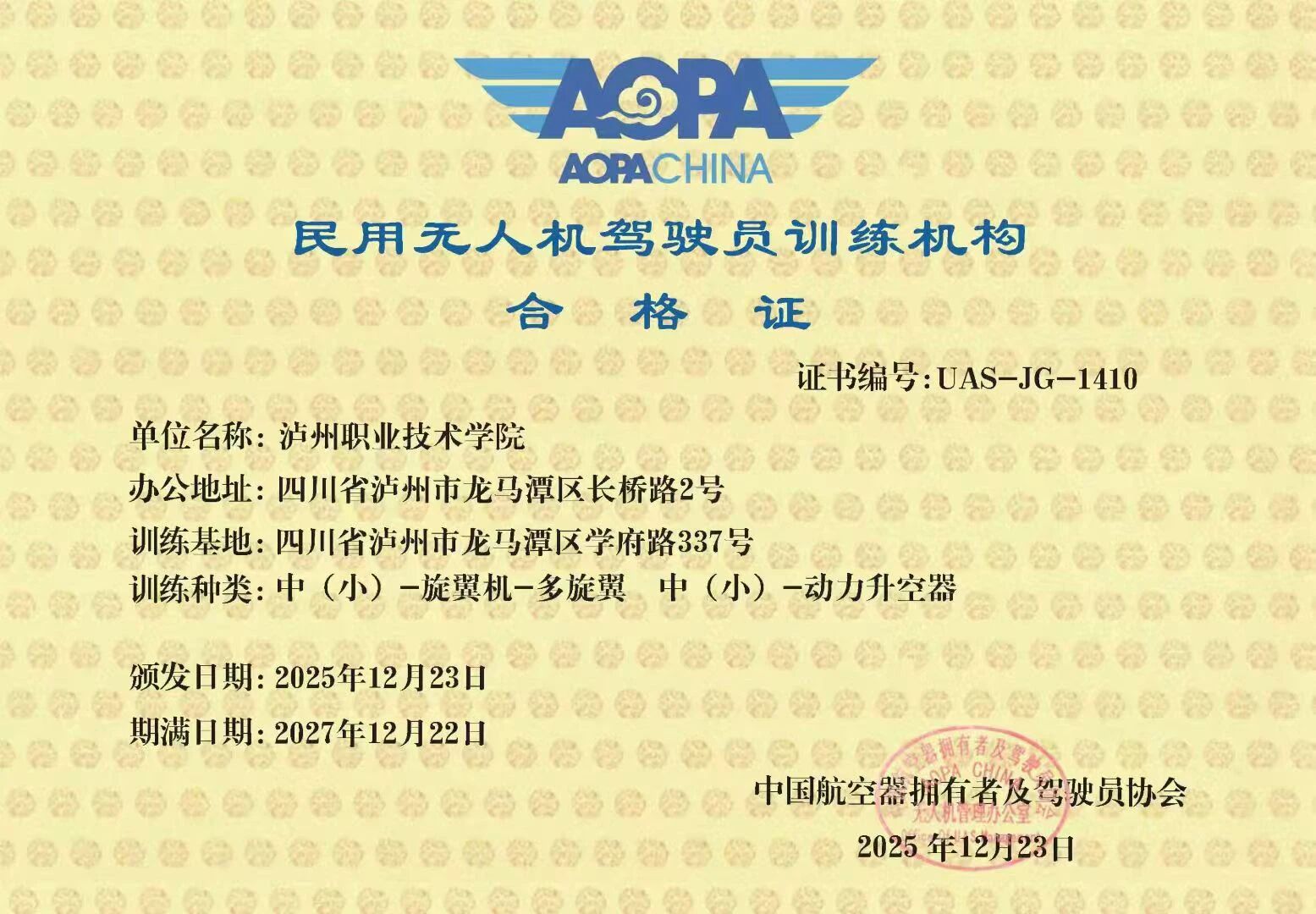 ▲无人机驾驶员训练机构合格证