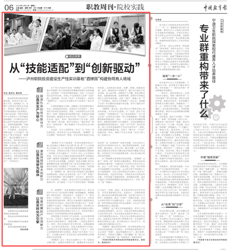 10月21日,《中国教育报》职教周刊·院校实践栏目专题报道我校创新性地建成集“实践教学、技能培训、真实生产、中试服务、活态传承、国际交流”六大功能于一体的生产性实训基地“酒博园”,构建真实生产、真实场景、真实转化协同作用的育人场域,推动人才培养从“技能适配”到“创新驱动”,为职业院校破解育人难题、服务产业升级提供了“泸职范式”。①教师示范准确移取酒样进行白酒勾调②企业大师亲授原酒品评③学生调制中式白...